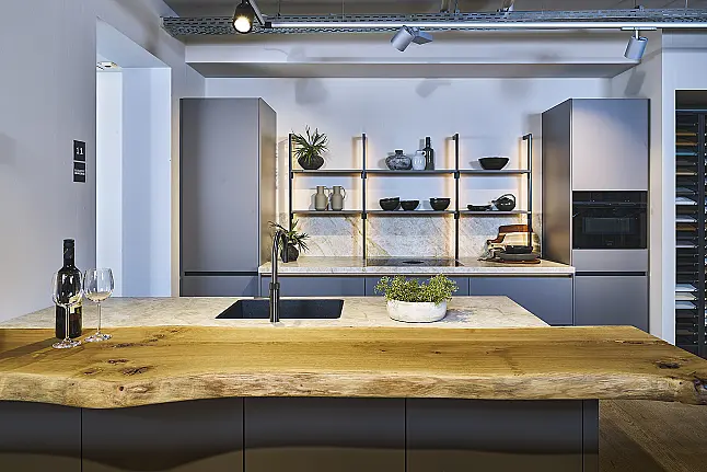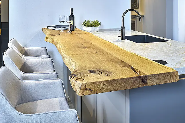 Moderne zandgrijze keuken met eiland en opvallend groot barblad